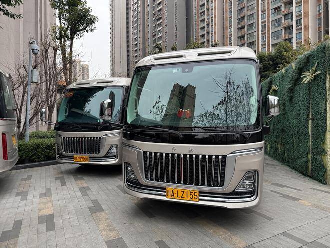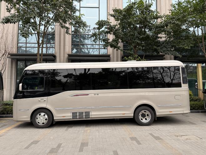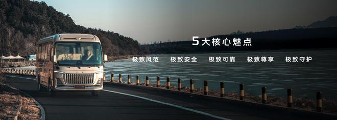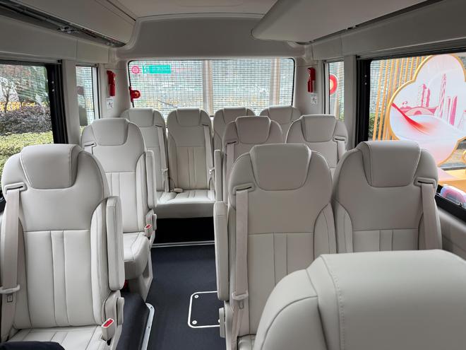 空间与人性化设计上,新车优势尽显:车内长宽高分别达到5443mm、1900mm、1900mm,提供17—23座多种灵活布局,其中17座车型座椅前后间距达960mm,保障充足乘坐空间;而同级首创的副驾驶车门设计,进一步提升了上下车的便捷性与人性化体验。